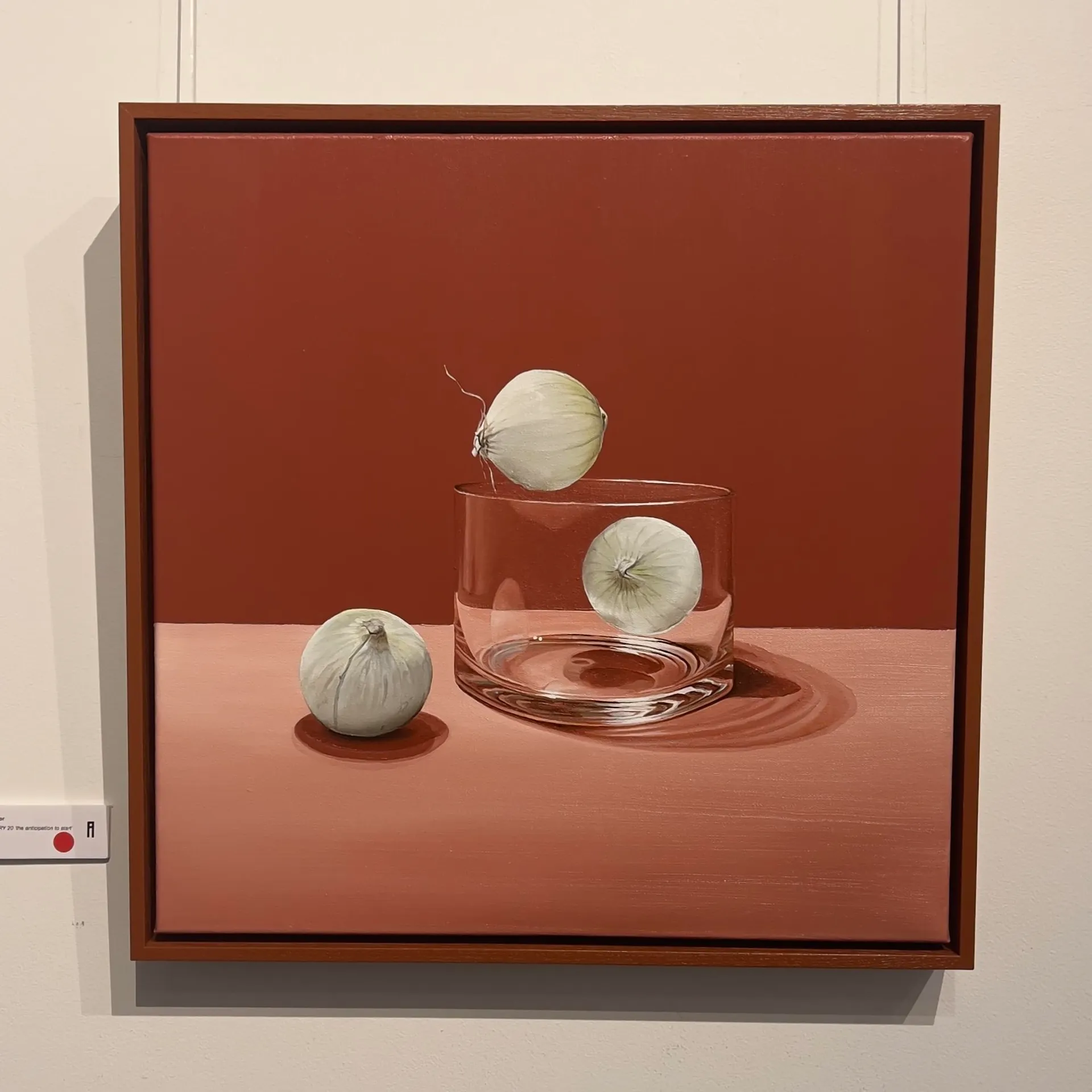 oils on linen, shadow box framed in natural oak painted in rust colour