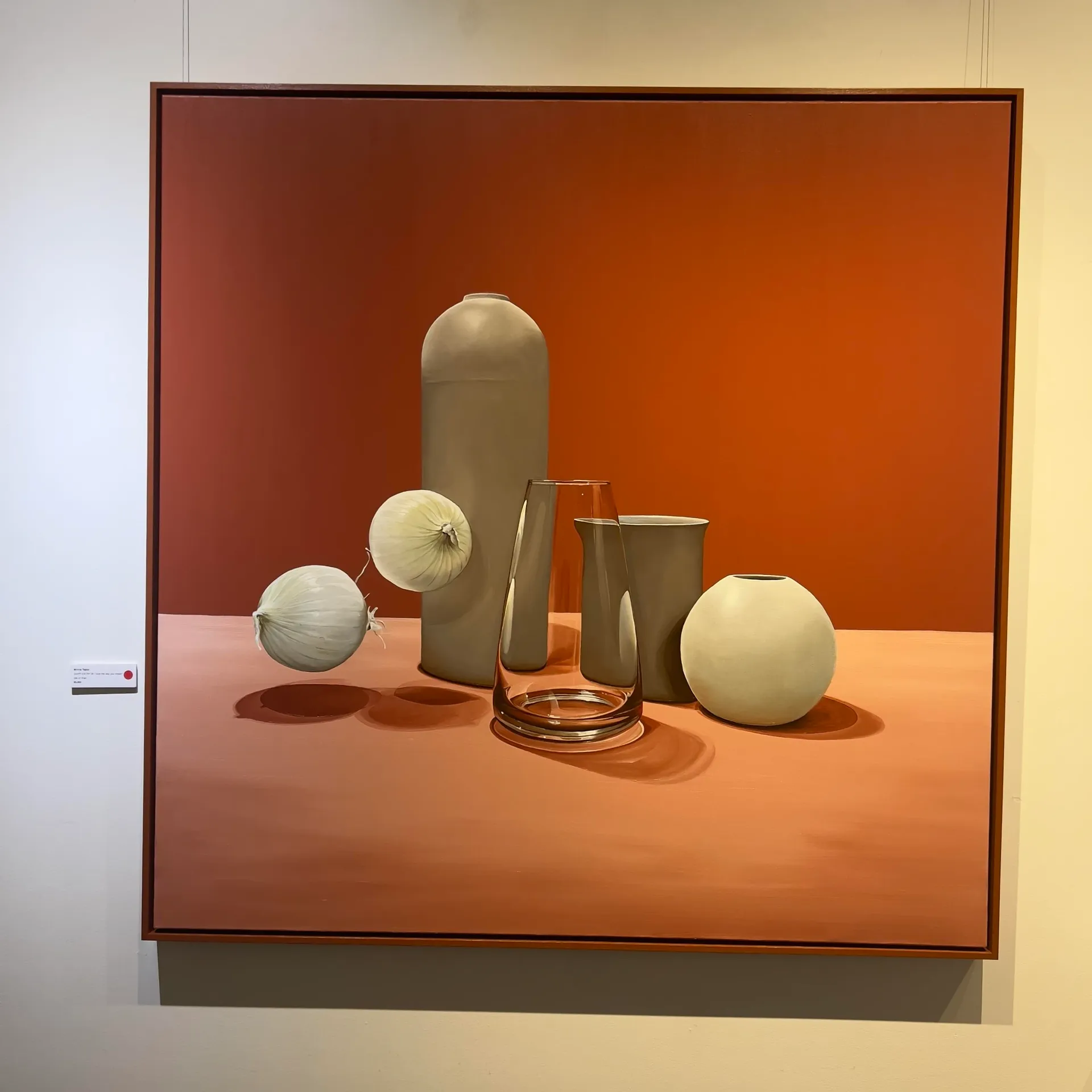 oils on linen, natural oak shadow box frame painted in a rust colour